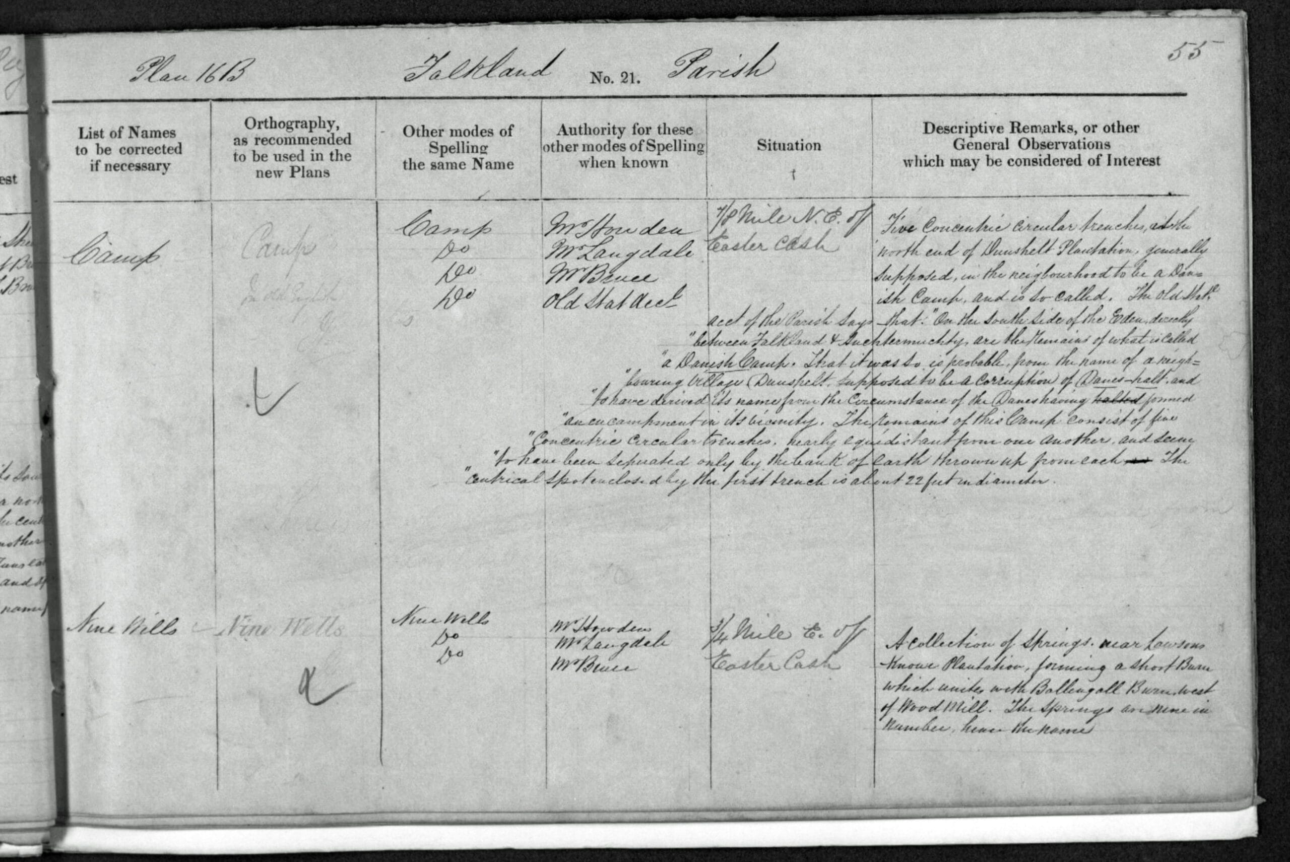map 1854The name itself gives rise to minor controversy, with two alternative spellings in common use. ‘Dunshalt’ (pronounced, and sometimes spelled ‘Dunshelt’) is, according to legend, a corruption of the term ‘Dane’s Hold’ after a local encampment of invading Danes who were defeated at Falkland Moor.
