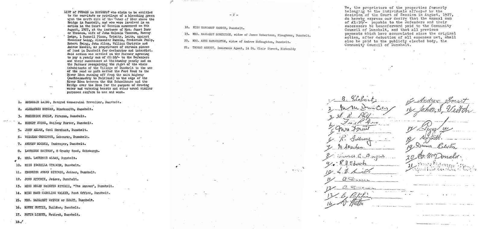 In 1927 the Feuars in the village gave up their rights to maintain a bleaching green along the north bank of the River Eden, upstream of the bridge, in return for an annual payment of £1:10/-.In addition, it was written into the agreement that everyone in the village retained the right to use the Ford Road for the purposes of drawing water and watering beasts. The Feuars, in turn, agreed that this payment should be made annually to the Dunshalt Community Council.